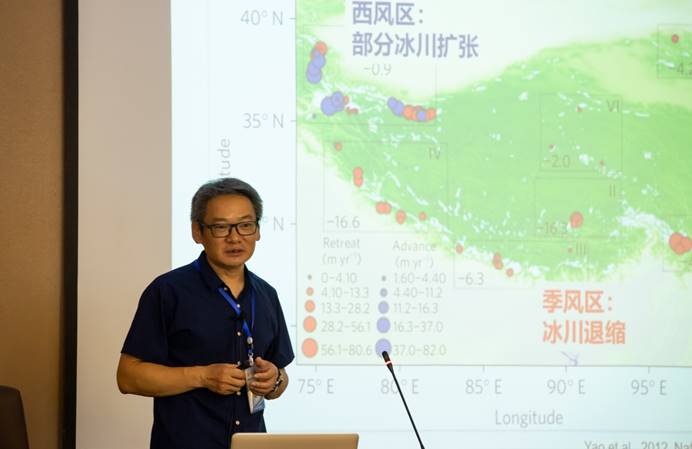 侯居峙研究员的报告介绍了获得长时间尺度冰川定量消融记录的全过程,即利用湖泊沉积物重建青藏高原过去长时间尺度、连续、高分辨率的冰川消融量记录,选择青藏高原西北部的郭扎错开展研究。研究团队进而通过郭扎错沉积物古地磁长期变(PSV)与区域PSV合成记录对比,建立了可靠的年龄控制,为进一步重建冰川消融量奠定基础。在获得可靠年龄控制基础上,研究团队最终将沉积物岩芯中细粒碳酸盐氧同位素(δ18O)作为评估入湖冰川融水水量的指标,定量重建了全新世西昆仑山冰川消融记录。这一研究不仅获得全新世西昆仑冰川消融量变化,也扩宽了高寒区古湖沼学的研究领域。