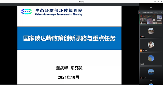 董战峰研究员作了题为《国家碳达峰政策创新思路与重点任务》的专题报告。首先介绍了我国提出“双碳”目标战略的背景。其次介绍了我国碳达峰促进政策的实践进展和总体思路,分析了我国目前碳排放政策方面的问题与不足。随后,指出了实现“双碳”目标的两大抓手:重点行业和地区,并提出了二者碳排放政策的创新方向。在此基础上,提出了夯实政策实施支撑能力的途径,以确保国家碳达峰促进政策的最终落地。最后,与相关专业的师生就该领域的热点问题进行了深入的讨论。