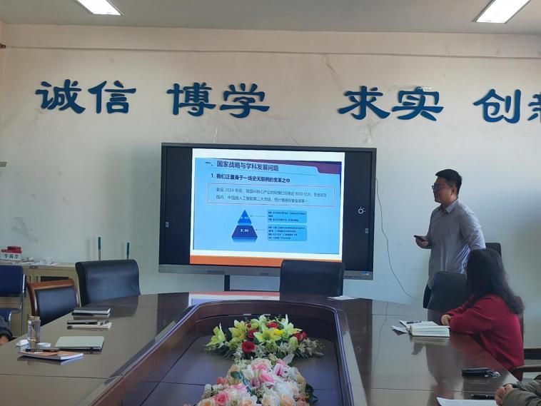 分享会上,程鹏、李涛、王晨光三位教师分别围绕大会主题,从理念解读、案例分享和路径提炼等方面进行汇报交流。大家结合自身教学科研实践,将会议精神转化为专业建设和课堂改革的具体思路。程鹏老师聚焦“数智时代地理科学类专业教育重构”,从“数智赋能、交叉融合、创新驱动”三个维度进行解读,强调要以AI和大数据为抓手重塑人才培养目标与课程体系,打通地理学与相关学科的交叉通道,把创新能力培养贯穿本科全过程。李涛老师重点展示了AI赋能地理教学的典型做法,结合汤国安教授、宋长青教授等专家案例,介绍智能可视化、空间大数据分析等在课堂中的具体应用,并围绕如何提升课堂吸引力、强化员工实践能力提出了可操作的改进建议。王晨光老师围绕“一流专业建设的综合提升路径”,重点分享兄弟高校在科研反哺教学、凝练学科特色、实践育人、课程思政、AI素养融入、对接地方战略和建设精品课程群等方面的先进做法,对学院地理学科发展具有借鉴意义。