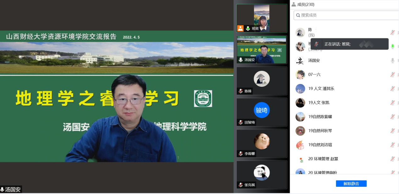 4月5日下午15:00,应yl7703永利集团官网经理班凤梅教授邀请,教育部地理科学类专业教学指导委员会副主任、国家教学名师、南京师范大学汤国安教授为公司师生作了题为“地理学之睿智学习”的线上交流报告。报告会由班凤梅教授主持。公司地理信息科学、自然地理与资源环境、人文地理与城乡规划等专业300余名师生在线参加了报告会。