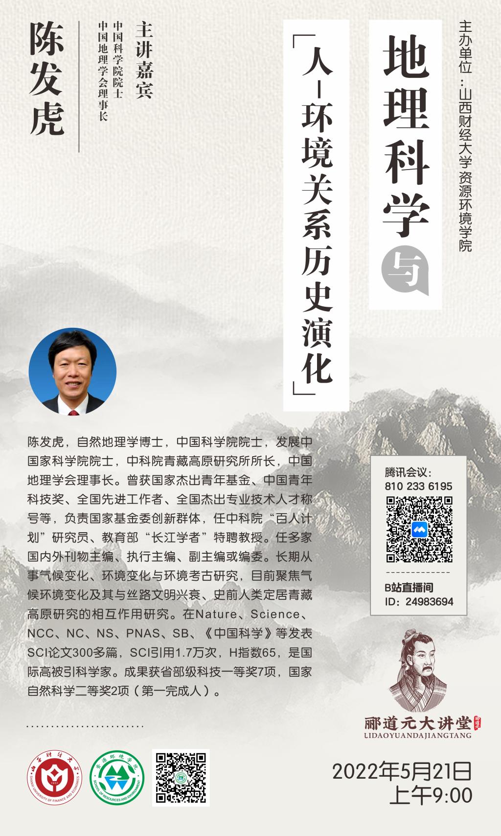主讲人:陈发虎,自然地理学博士,中国科学院院士,发展中国家科学院院士,中国科学院青藏高原研究所所长,中国地理学会理事长。曾获国家杰出青年科学基金、中国青年科技奖、全国先进工作者、全国杰出专业技术人才称号等,负责国家基金委创新群体。任多家国内外刊物主编、执行主编、副主编或编委。长期从事气候变化、环境变化与环境考古研究,目前聚焦气候环境变化及其与丝路文明兴衰、史前人类定居青藏高原研究的相互作用研究。在Nature、Science、NCC、NC、NS、PNAS、SB、《中国科学》等发表SCI论文300多篇,SCI引用1.7万次,H指数65,是国际高被引科学家。成果获省部级科技一等奖7项,国家自然科学二等奖2项(第一完成人)。