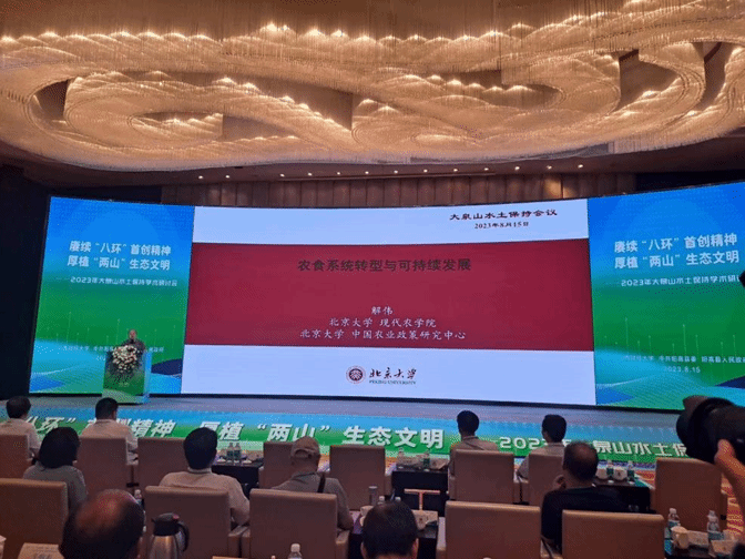 2023年8月15日上午,在yl7703永利集团官网、中共阳高县委和阳高县人民政府联合主办的赓续“八环”首创精神,厚植“两山”生态文明-2023年大泉山水土保持学术研讨会上,yl7703永利集团官网主办的“郦道元大讲堂”特别组织了“阳高县大泉山专场”,应会务组邀请,北京大学现代农学院研究员、北京大学中国农业政策研究中心副主任解伟作了题为“农食系统转型与可持续发展”的学术交流报告。